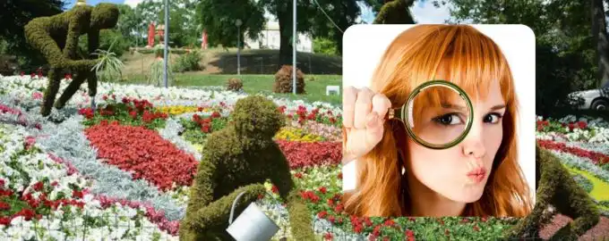 Na pestrobarevné fotografii záhonů se mezi zelenými sochami skrývá malý ptáček. Klíčem k jeho nalezení je změnit úhel pohledu a zaměřit se na detaily