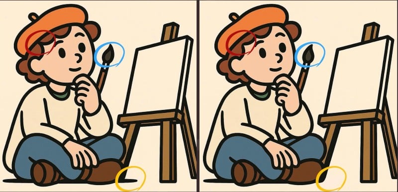 Na první pohled jsou dva obrázky umělce v ateliéru identické, ale skrývají tři jemné rozdíly. Dokážete je všechny najít za 79 sekund? Klíčem je systematické prohledávání obrazu po částech.