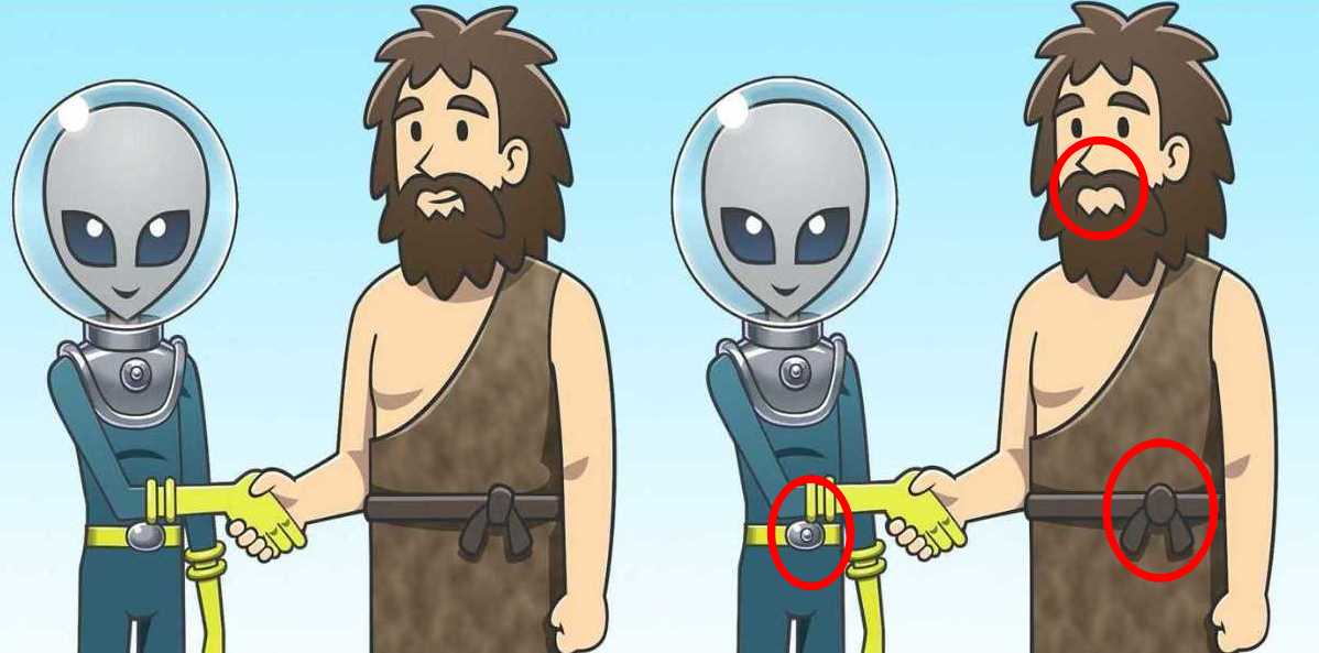 Na dvou zdánlivě identických obrázcích s mimozemšťany a jeskynními lidmi se skrývají tři rozdíly. Váš úkol je najít je všechny za pouhých 25 sekund. Klíčem je soustředit se na detaily a nenechat se zmást celkovým dojmem.