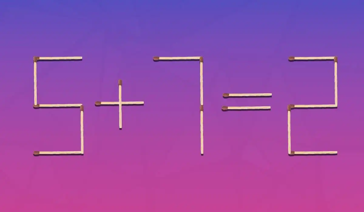Zpět. Máme 5 + 7 = 1 (kde 1 je zbytek po odebrání sirky z dvojky). Kam dát sirku, aby rovnice dávala smysl? Dejte ji před číslo 1. Z čísla 1 se stane číslo 7? Ne, k tomu potřebujete více sirek. Klíč je jinde. Zkuste tu samou horizontální sirku z dvojky přemístit na znaménko plus tak, aby se změnilo na znaménko mínus. Ano! Přesně tak. Odeberte vodorovnou sirku z prostředku dvojky (2) a položte ji šikmo přes znaménko plus. Plus se tak změní na znak násobení (×)? Ne, šikmá čára přes plus dává jiný význam. Ale pokud ji položíte svisle na vodorovnou čáru plusu, vytvoříte z plusu čtverec? Ne, vytvoříte znaménko mínus! Stačí otočit její orientaci.