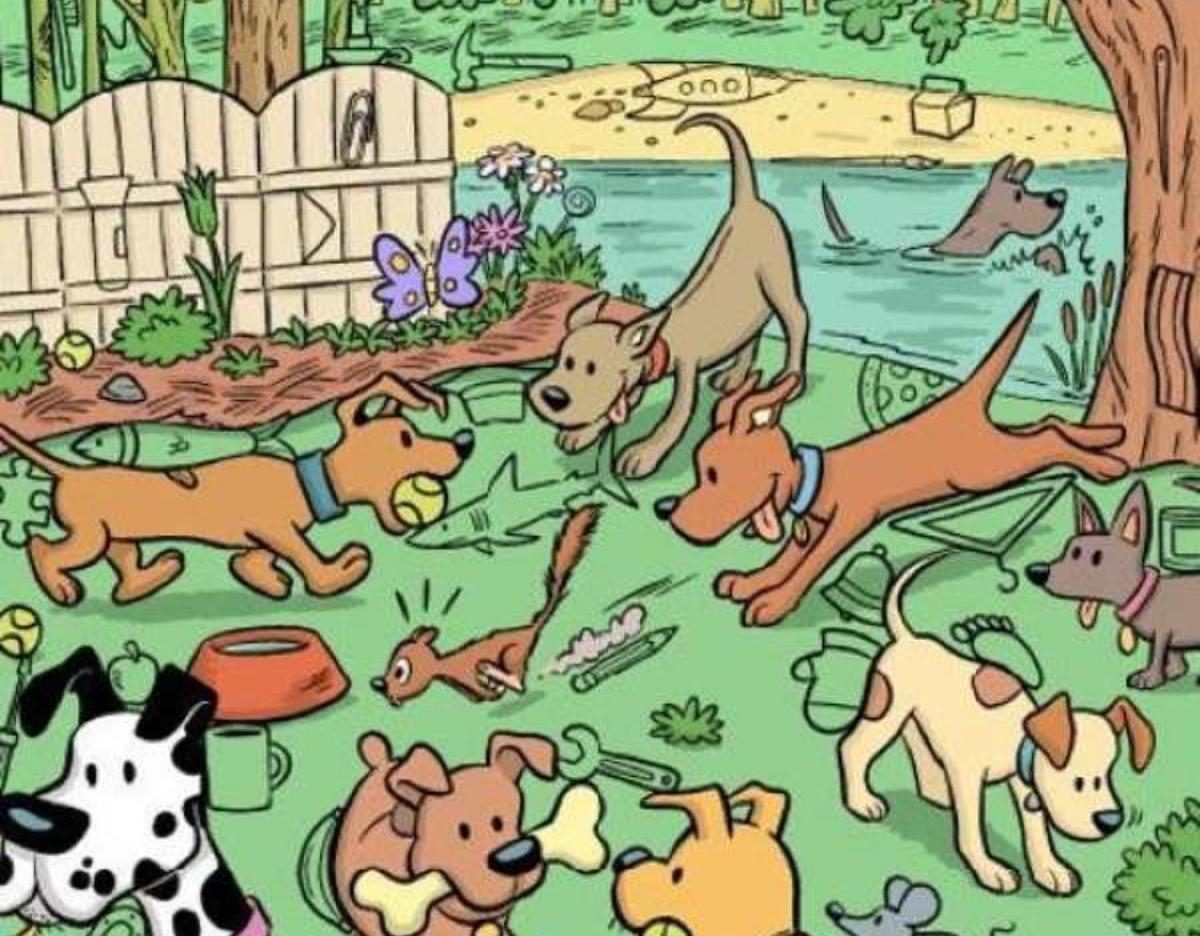 Mezi hrajícími si psy na obrázku je ukrytý magnet. Klíčem k jeho nalezení je změnit úhel pohledu a hledat ne psa, ale tvar – magnet je součástí jednoho z nich.