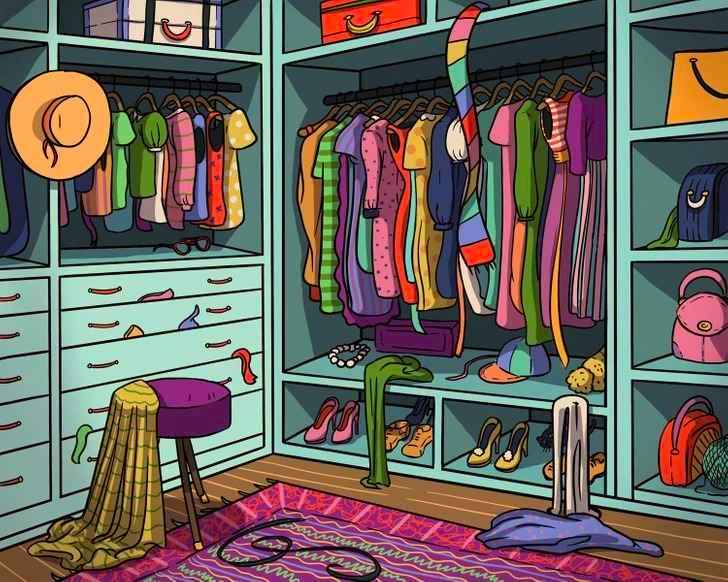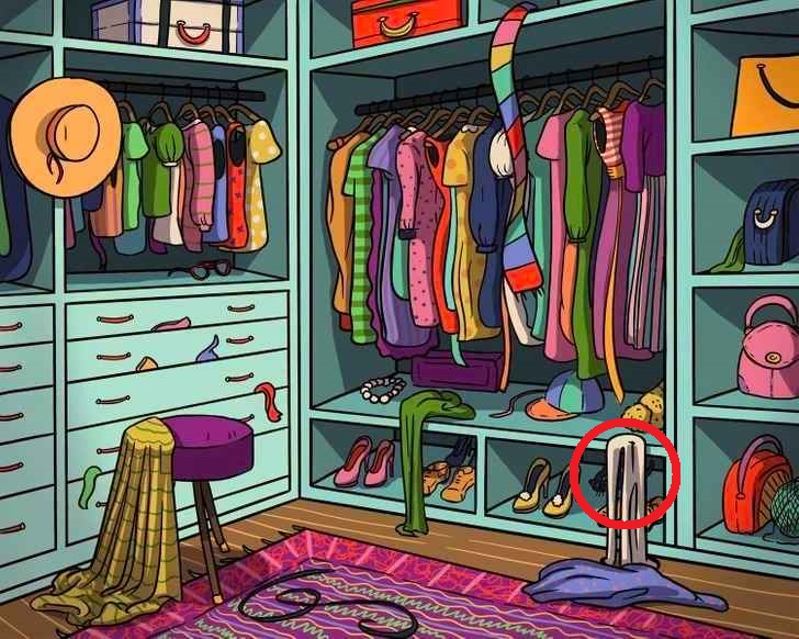 Na první pohled je to jen přeplněná skříň, ale někde mezi oblečením a haraburdím se ukrývá živý tvor. Klíčem k jeho nalezení není rychlé přejíždění pohledem, ale systematické prozkoumání textur a tvarů, které do sebe nezapadají.