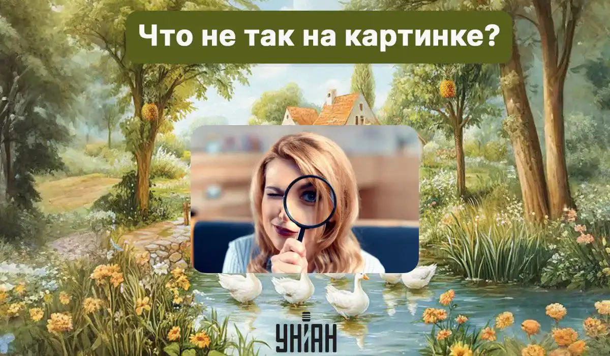 Na idylickém obrázku s domem, stromy a rybníkem se skrývá jeden absurdní detail, který okamžitě narušuje realitu scény. Klíč k jeho nalezení spočívá v pozorování toho, co na stromech přirozeně neroste.