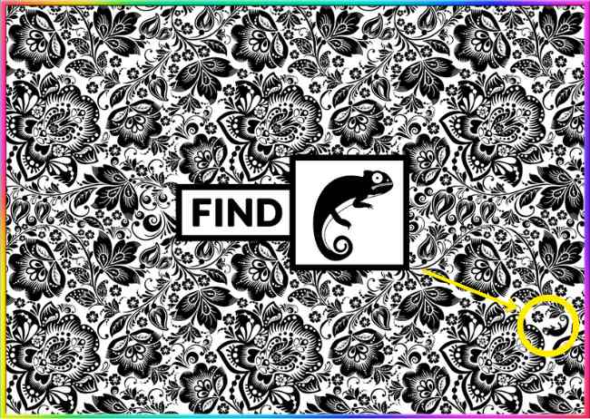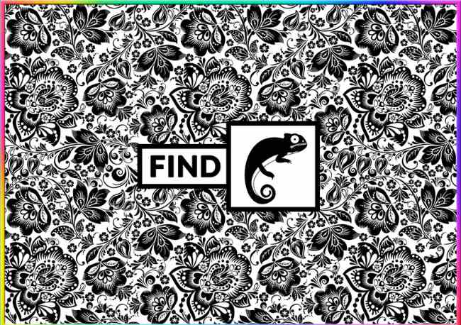 Na barevném ornamentu se skrývá mistr kamufláže – chameleon. Jeho dokonalé splynutí s okolím je testem vaší pozornosti a schopnosti vidět patent. Klíčem je nepřemýšlet o zvířeti jako o celku, ale hledat známé tvary, jako je oko nebo charakteristický ocas.