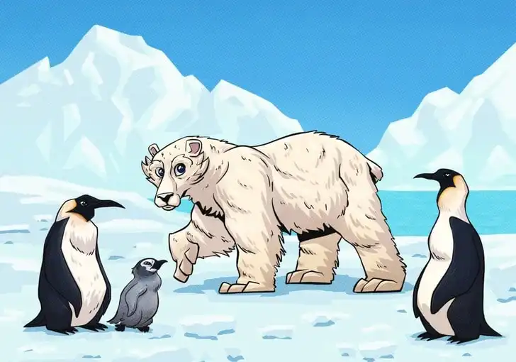 Na obrázku je lední medvěd a tučňáci na jednom místě. To je ale nemožné, protože tato zvířata žijí na opačných koncích planety. Klíčem k řešení není hledat chybu v kresbě, ale v základních geografických znalostech.