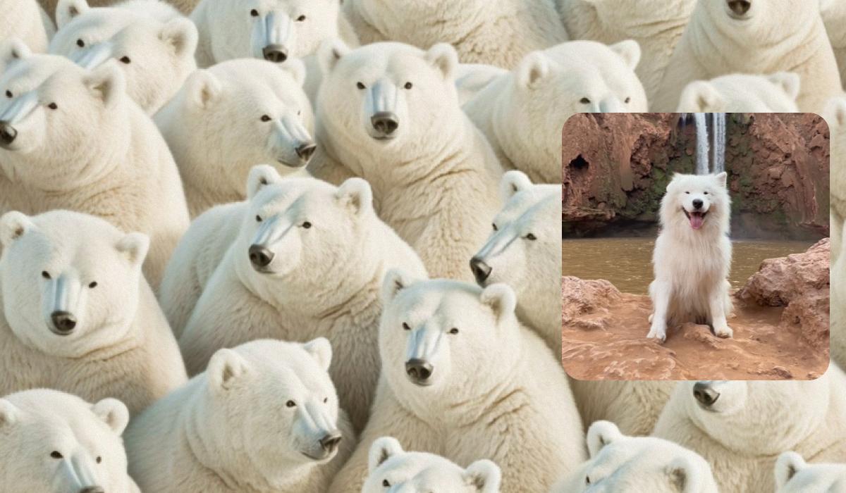 Mezi desítkami ledních medvědů na obrázku se skrývá jeden roztomilý pes samojed. Vzhledem k podobnosti obou zvířat je úkol záludný, ale klíčem k úspěchu je soustředit se na drobné detaily, jako je tvar hlavy a výraz obličeje.