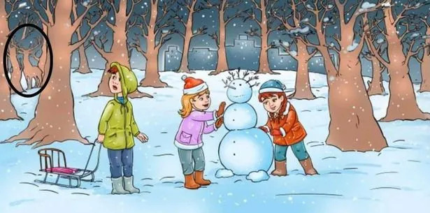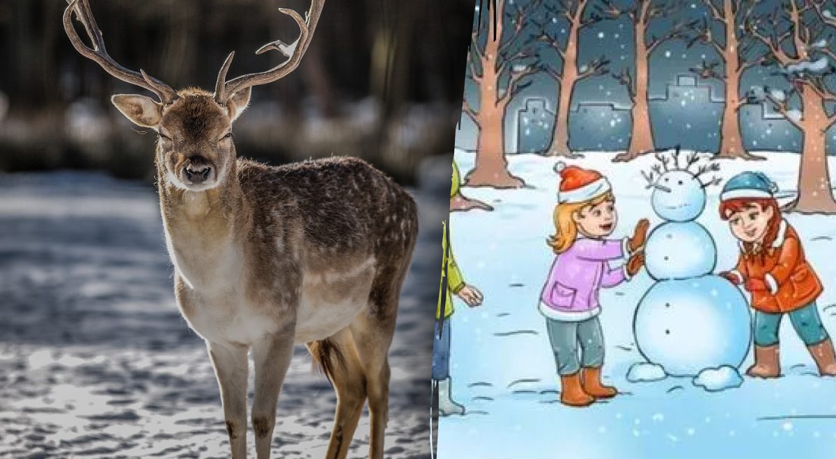Představte si tu scénu: svěží sníh, děti si hrají, staví sněhuláka a chystají se na sáňkování. Obrázek dýchá poklidnou zimní atmosférou. Ale je tu jeden malý trik. Mezi tímto rušivým děním se skrývá jelen. Není to velká dominanta obrázku, naopak. Je mistrně začleněn do lesního pozadí, splynutí s přírodou je dokonalé. Dokážete ho odhalit dřív, než vám uplyne časový limit?