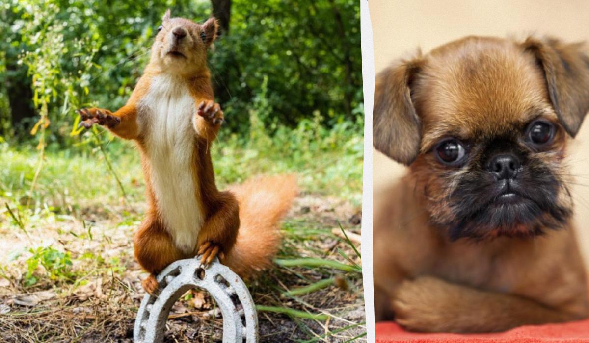 Pes je dokonale kamuflovaný a veverka úmyslně odvádí pozornost jako výrazný dominantní prvek.