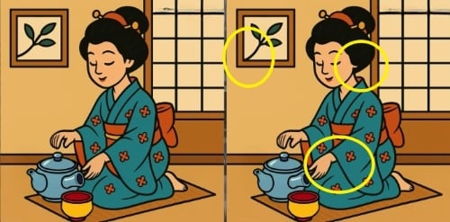 Řešení je následující: První rozdíl je v šálku – na jednom z obrázků chybí malá ozdobná linka na jeho okraji. Druhý rozdíl najdete na rukávu ženy, kde se liší počet a umístění světlých ornamentů. Třetí rozdíl je v pozadí – na jedné straně chybí malý světlý obloukový prvek vedle ženina lokte. Když tyto detaily najdete, hádanka je vyřešena.