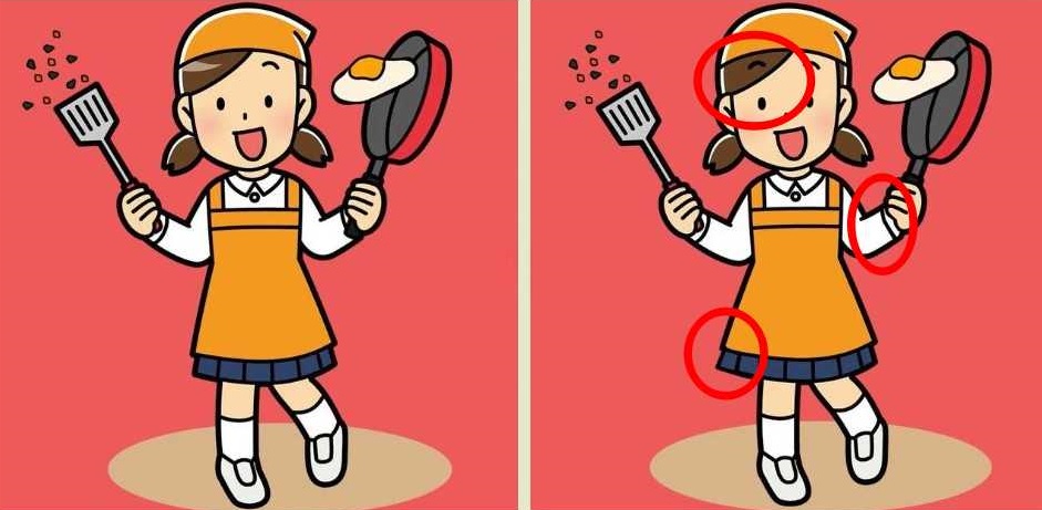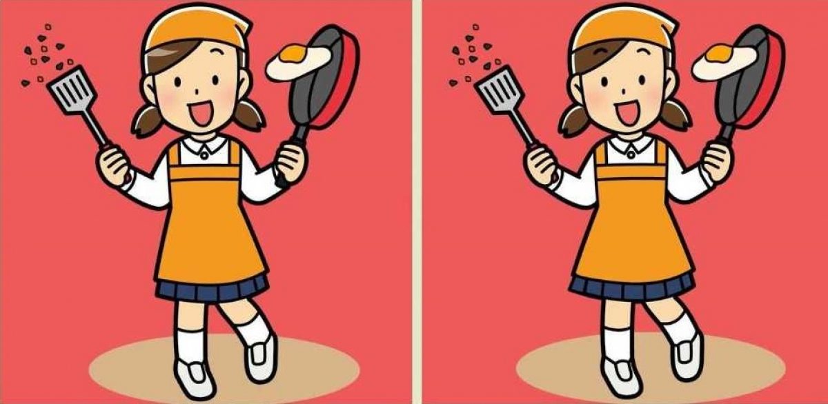 Vaším úkolem je prozkoumat dva téměř totožné obrázky. Zachycují dívku, která se snaží udržet míchaná vajíčka v pánvi, ale hrozí, že jí spadnou na podlahu. Na první pohled je vše stejné. Ale pozor! Mezi obrázky se skrývají tři rozdíly. Dokážete je všechny odhalit dříve, než vám vyprší čas?