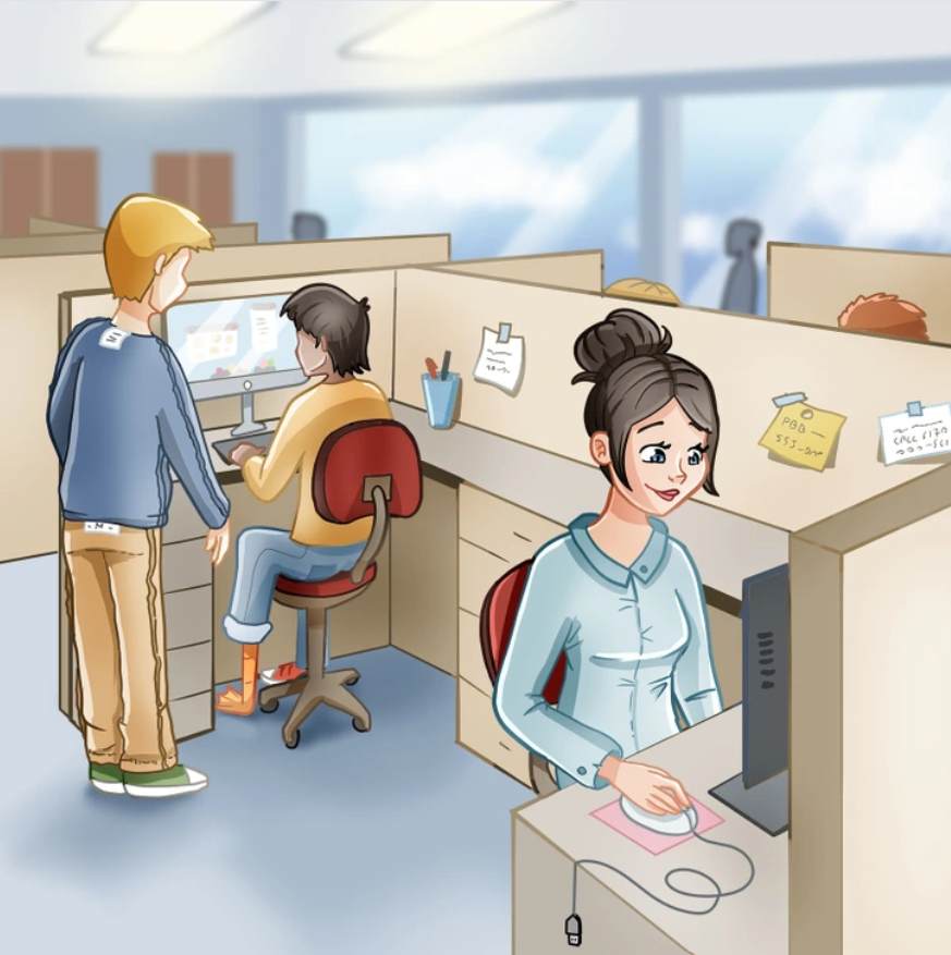 Na tomto obrázku kanceláře se skrývají tři zjevné, ale zároveň snadno přehlédnutelné chyby. Klíčem k jejich nalezení není jen rychlost, ale systematické skenování každého detailu – od pracovních pomůcek po oblečení postav.