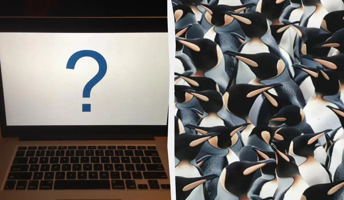 Mezi hromadou černobílých tučňáků se ukrývá jeden pták, který mezi ně nepatří – straka. Klíčem k jejímu nalezení je soustředit se ne na celkový tvar, ale na jeden konkrétní a neobvyklý detail, který ji od okolí odlišuje.