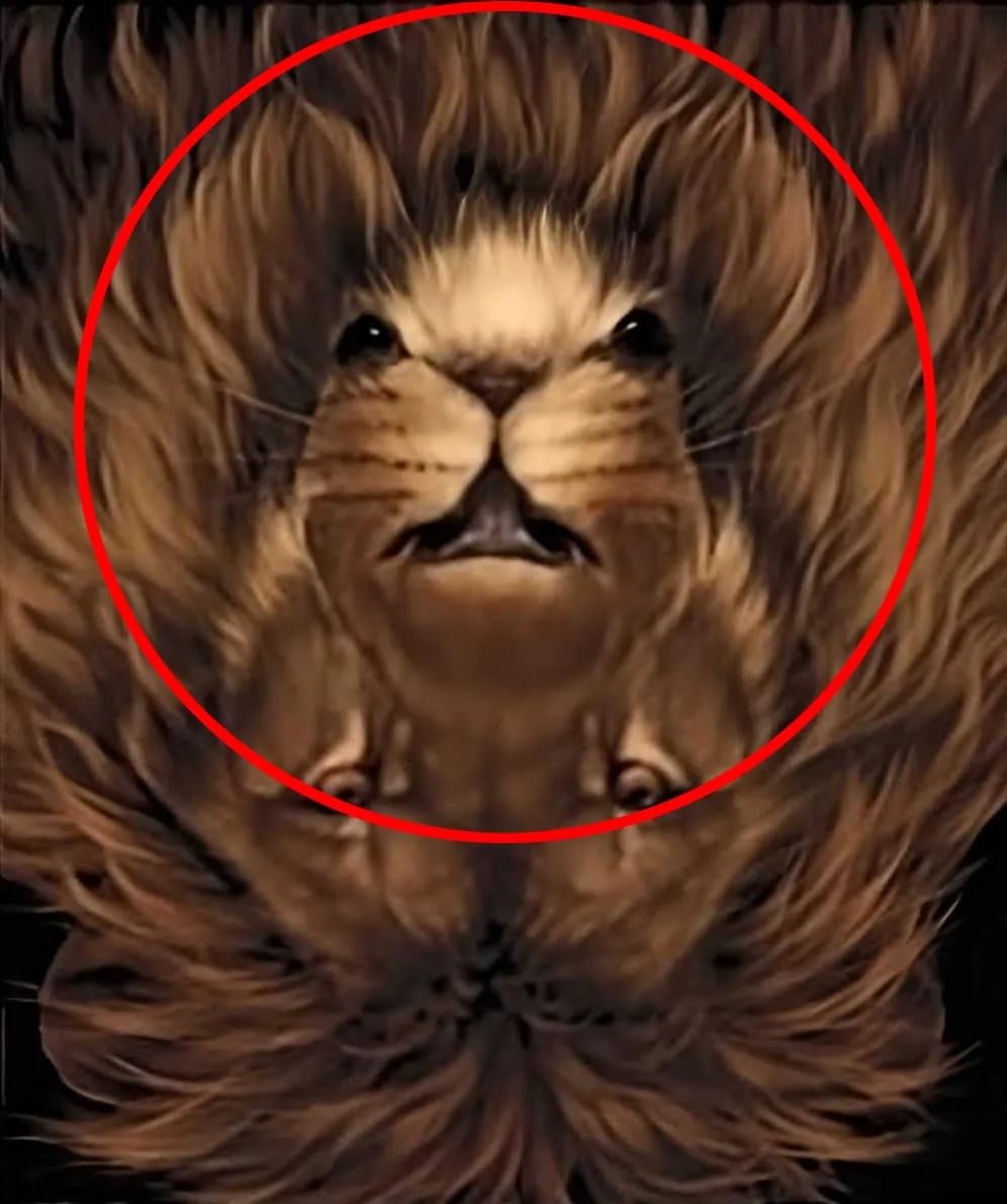 Podívejte se na lvovo levé ucho (to napravo od vás na obrázku). Přímo pod ním, v husté hřívě, se nachází myš. Její hlava směřuje k lvovu čelu, zatímco její tělo a ocas klesají dolů podél krku. Myš není nakreslena jako samostatný objekt, ale je vytvořena stínováním v srsti. Jakmile ji jednou uvidíte, už ji nemůžete „odvidět“. Váš mozek přepnul z režimu „lev“ na režim „lev a myš“.