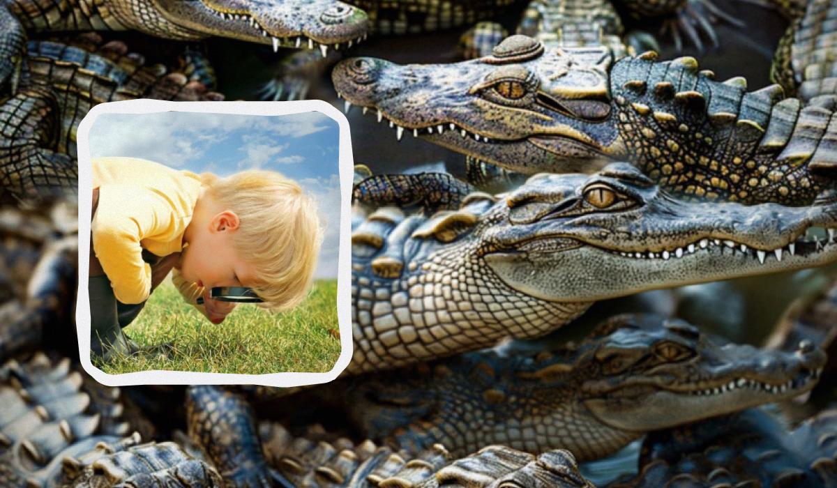 Obrázek je plný zubatých krokodýlích hlav, které vypadají téměř identicky. Vytvářejí dojem chaotického, ale opakujícího se vzoru. Vaše vnímání se automaticky zaměřuje na dominantní prvky – široké čenichy, ostré zuby a tmavou barvu. Právě tato automatická selekce je past. Malá ještěrka je dokonale maskovaná, protože sdílí podobnou barevnou paletu, ale její tvar a velikost jsou odlišné. Jde o test pozornosti k detailu a schopnosti potlačit prvotní dojem.