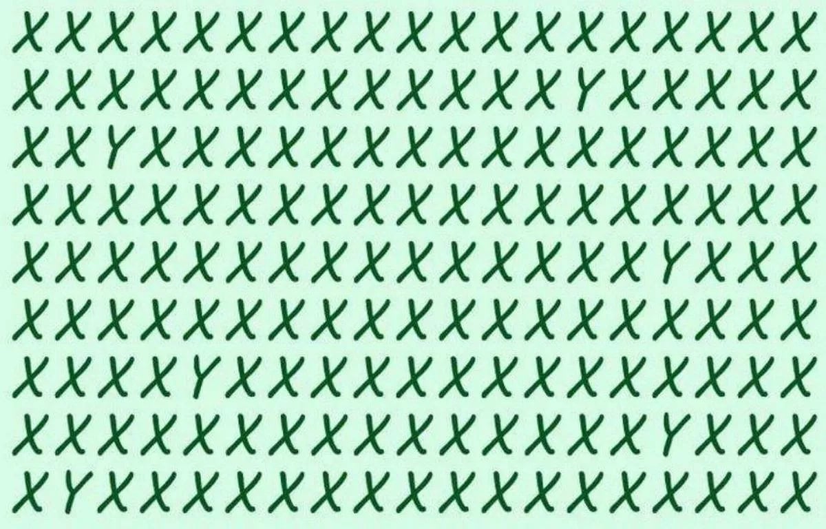 V této vizuální výzvě je vaším úkolem najít šest písmen Y skrytých v moři písmen X. Časový limit je 13 sekund, což testuje vaši schopnost rychlé koncentrace a postřehu. Klíčem je systematické prohledávání řádek po řádce.