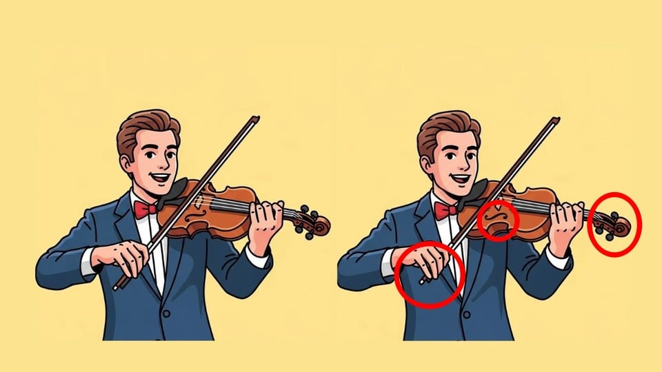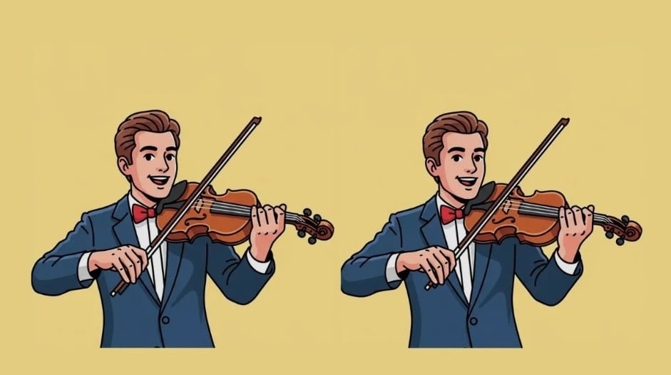 Před vámi jsou dva téměř identické obrázky houslisty, ale skrývají tři jemné rozdíly. Dokážete je všechny najít za 37 sekund? Klíčem je systematické prohledávání obrazu po částech.