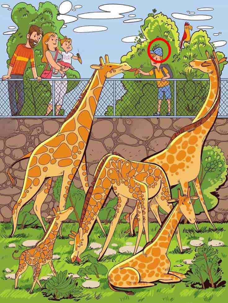 Řešení je jednoduché, když víte, kam se dívat. Jahoda není volně ležící objekt, ale součást potisku na tričku malého chlapce, který krmí žirafu. Konkrétně se nachází na jeho hrudi. Její červený tělový tvar se zeleným kalíškem je jasně rozpoznatelný, jakmile se na toto místo zaměříte. Oklamání spočívalo v tom, že mozek automaticky vyhledává jahodu jako samostatný předmět v prostředí, ne jako dekor na textilu.