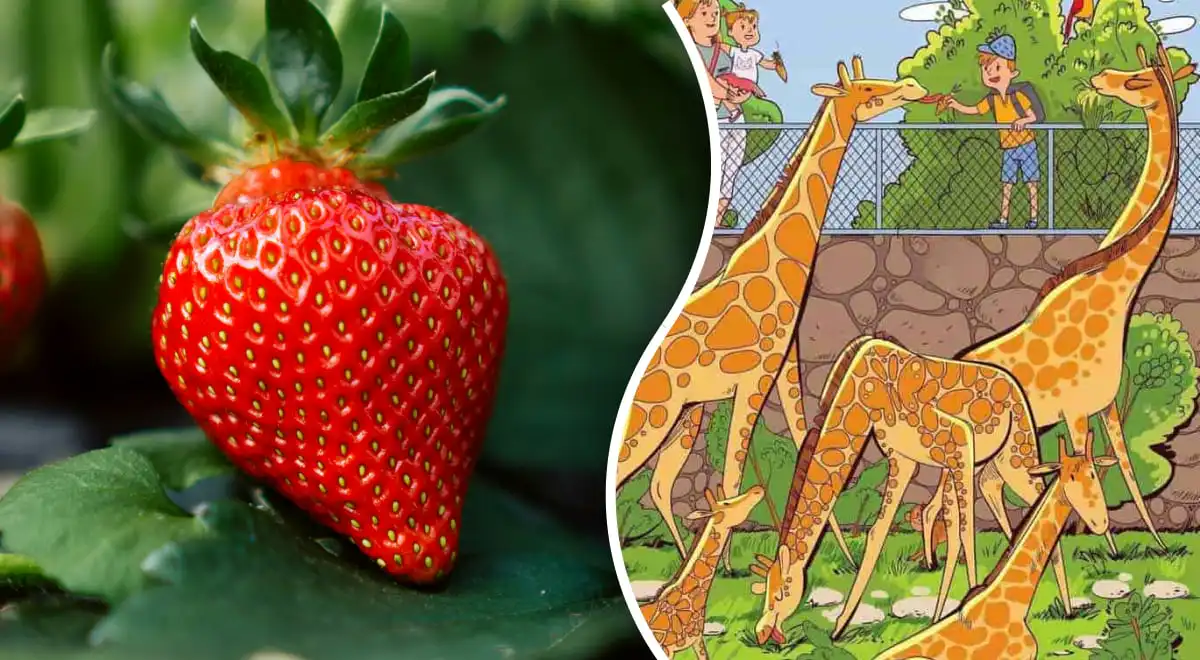 Na obrázku plném žiraf, lidí a zeleně se skrývá dokonale maskovaná jahoda. Klíčem k jejímu nalezení je změnit perspektivu a hledat ne ovoce, ale jeho charakteristický tvar a barvu v nečekaných detailech výjevu.