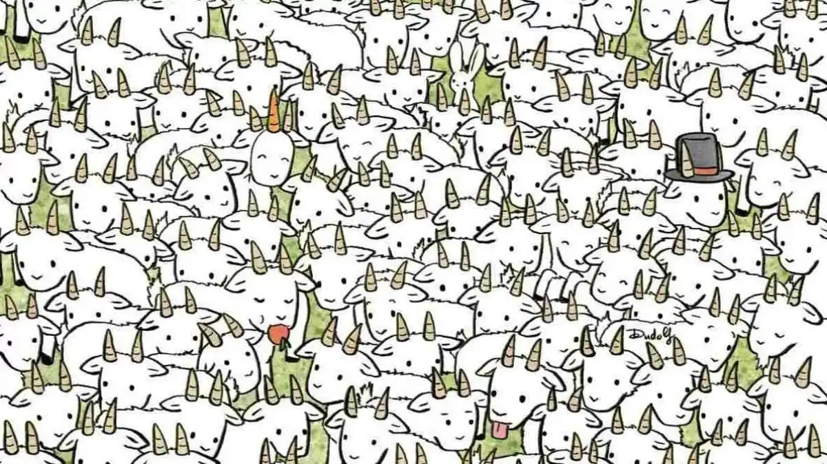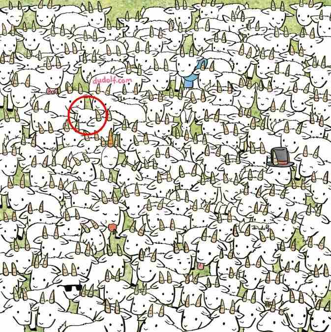 Na obrázku plném koz je ukrytá jedna ovce. Váš úkol? Najít ji co nejrychleji. Klíčem k úspěchu je změnit úhel pohledu a hledat jemné rozdíly v srsti a tvaru hlavy, které ji odhalí.