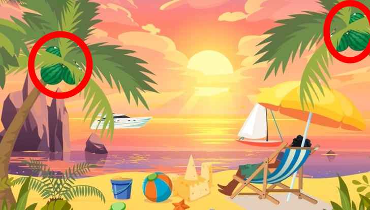 Máte to? Pokud ne, tady je řešení. Chyba spočívá v tom, že na kmenech kokosových palem rostou velké zelené melouny. Kokosová palma přitom plodí kokosy – velké, hnědé, vláknité ořechy, které rostou v trsech pod korunou listů, ne přímo na kmeni. Melouny jsou plody tykvovitých rostlin, které rostou na zemi nebo popínavých liánách. Toto spojení je tedy čistě výtvorem fantazie nebo nedopatření autora obrázku.