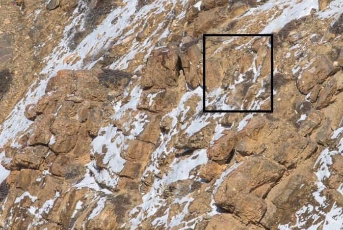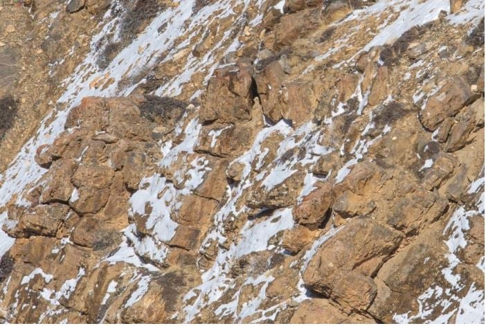 Na první pohled je to jen fotografie zasněžených skal, ale někde tam číhá dokonale maskovaný levhart sněžný. Klíčem k jeho nalezení je změna perspektivy a hledání narušení přirozeného vzoru terénu, nikoli tvaru zvířete.