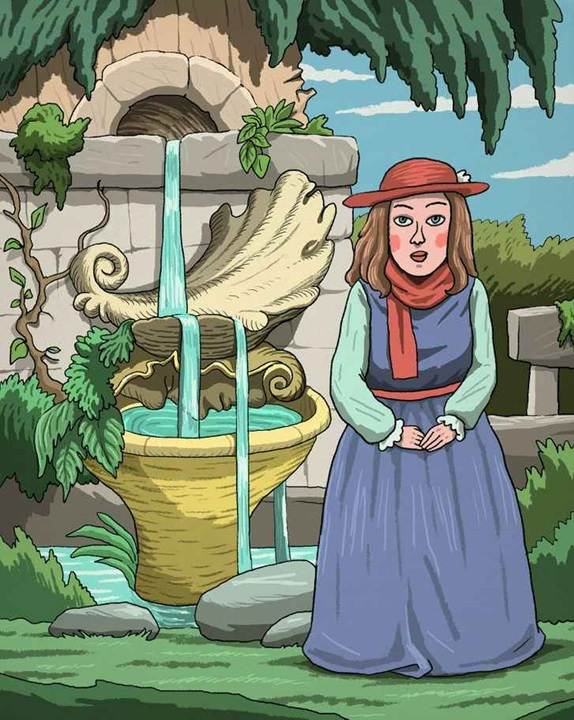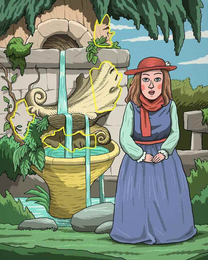 Na obrázku dívky u fontány je skryto několik tváří, které se organicky prolínají s okolím. Klíčem k jejich nalezení je opustit doslovné vnímání a hledat převrácené obrazy a iluzorní kontury vytvořené světlem a stíny.