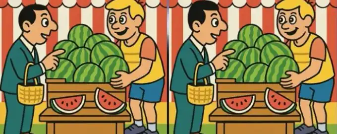 Výzva pro pozorné oči! Na dvou zdánlivě identických obrázcích muže s melounem se skrývají tři jemné rozdíly. Dokážete je všechny odhalit dříve, než uplyne 27 sekund?