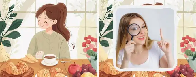 Máte jen 11 sekund na to, abyste našli čtyři rozdíly mezi dvěma zdánlivě stejnými obrázky snídající dívky. Klíčem je systematické prohledání každého kousku